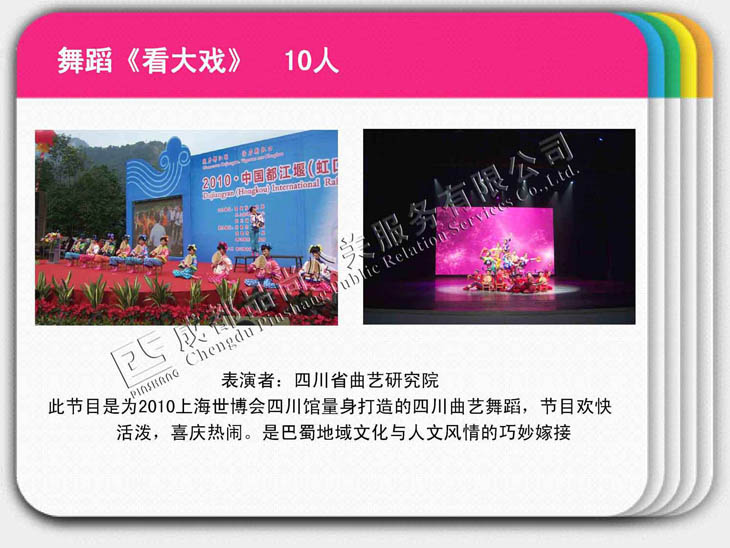 此節(jié)目是為2010上海世博會四川館量身打造的四川曲藝舞蹈,節(jié)目歡快活潑,喜慶熱鬧。是巴蜀地域文化與人文風情的巧妙嫁接