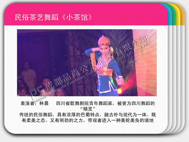 傳統(tǒng)的民俗舞蹈,具有濃厚的巴蜀特點,融古樸與現(xiàn)代為一體,既有柔美之態(tài),又有剛勁的之力,帶觀者進入一種美輪美奐的境地